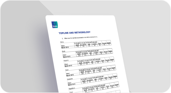 TOPLINE AND METHODOLOGY 5. When was the last time you shared a meal with someone who is… White In the last In the last In the last A year ago Wave: month six months year or more Never Not sure Skipped March 10-13 77% 6% 4% 5% 3% 5% 1% Black In the last In the last In the last A year ago Wave: month six months year or more Never Not sure Skipped March 10-13 39% 15% 9% 18% 8% 10% 1% Hispanic In the last In the last In the last A year ago Wave: month six months year or more Never Not sure Skipped March 10-13 42% 13% 8% 14% 9% 13% 1% Asian In the last In the last In the last A year ago Wave: month six months year or more Never Not sure Skipped March 10-13 28% 13% 8% 18% 17% 16% 1% Democrat In the last In the last In the last A year ago Wave: month six months year or more Never Not sure Skipped March 10-13 54% 9% 4% 4% 5% 23% 1% Republican In the last In the last In the last A year ago Wave: month six months year or more Never Not sure Skipped March 10-13 48% 11% 5% 5% 8% 23% 1% Evangelical Christian In the last In the last In the last A year ago Wave: month six months year or more Never Not sure Skipped March 10-13 28% 8% 5% 9% 14% 35% 1% Agnostic/Non-religious In the last In the last In the last A year ago Wave: month six months year or more Never Not sure Skipped March 10-13 35% 8% 5% 7% 12% 32% 1% 2020 K Street, NW, Suite 410 Contact: Chris Jackson Washington DC 20006 Senior Vice President, US, Public Affairs, Ipsos +1 202 463-7300 Email: chris.jackson@ipsos.com Tel: +1 202 420-2025