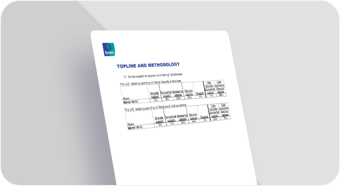 TOPLINE AND METHODOLOGY 17. Do you support or oppose the following? (Continued) The U.S. reducing spending on Social Security & Medicare Total Total Strongly/ Somewhat Strongly Somewhat Somewhat Strongly Somewhat /Strongly Wave: support support oppose oppose Skipped support oppose March 10-13 3% 8% 26% 62% 1% 11% 88% The U.S. reducing spending on Medicaid & food assistance Total Total Strongly/ Somewhat Strongly Somewhat Somewhat Strongly Somewhat /Strongly Wave: support support oppose oppose Skipped support oppose March 10-13 6% 17% 30% 46% 1% 23% 76% 2020 K Street, NW, Suite 410 Contact: Chris Jackson Washington DC 20006 Senior Vice President, US, Public Affairs, Ipsos +1 202 463-7300 Email: chris.jackson@ipsos.com Tel: +1 202 420-2025