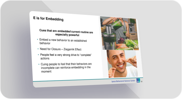 E is for Embedding Cues that are embeddedcurrent routine are especially powerful • Embed a new behavior to an established behavior • Need for Closure – Ziegarnik Effect • People feel a very strong drive to “complete” actions • Cuing people to feel that their behaviors are incomplete can reinforce embedding in the moment Ipsos Behavioral Science Center 23