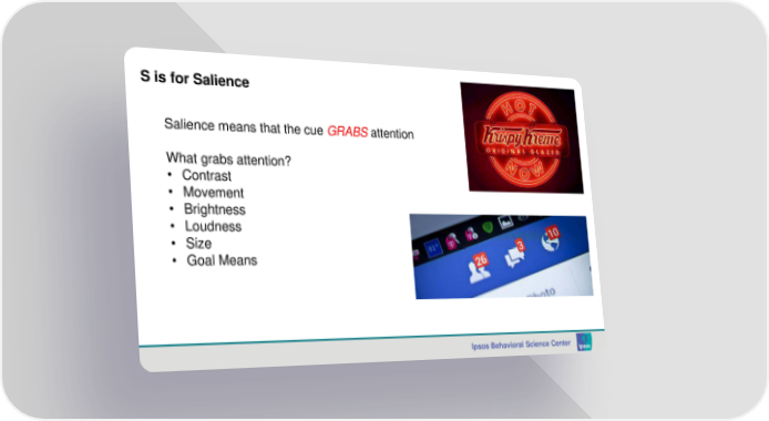 S is for Salience Salience means that the cue GRABS attention What grabs attention? • Contrast • Movement • Brightness • Loudness • Size • Goal Means Ipsos Behavioral Science Center
