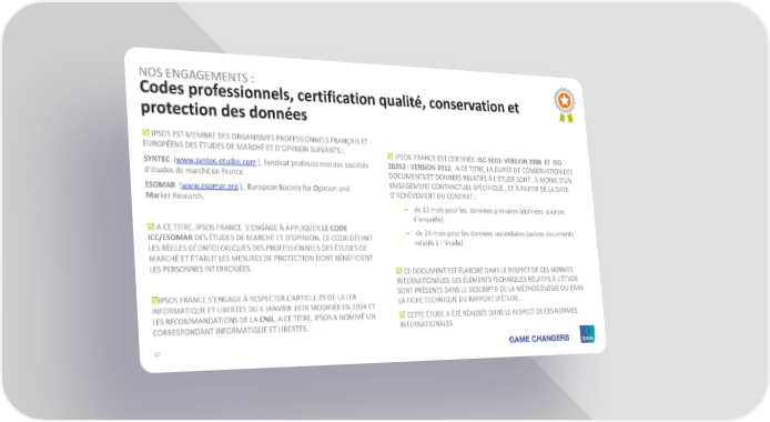 NOS ENGAGEMENTS : Codes professionnels, certification qualité, conservation et protection des données IPSOS EST MEMBRE DES ORGANISMES PROFESSIONNELS FRANÇAIS ET EUROPÉENS DES ÉTUDES DE MARCHÉ ET D’OPINION SUIVANTS: IPSOS FRANCE EST CERTIFIÉE ISO9001: VERSION 2008 ET ISO SYNTEC (www.syntec-etudes.com), Syndicat professionnel des sociétés 20252 : VERSION 2012. A CE TITRE, LA DURÉE DE CONSERVATION DES d’études de marché en France DOCUMENTS ET DONNÉES RELATIFS À L’ÉTUDE SONT , À MOINS D’UN ESOMAR (www.esomar.org), European Society for Opinion and ENGAGEMENT CONTRACTUEL SPÉCIFIQUE , ET À PARTIR DE LA DATE Market Research, D’ACHÈVEMENT DU CONTRAT : – de 12 mois pour les données primaires (données sources d’enquête) A CE TITRE, IPSOS FRANCE S’ENGAGE À APPLIQUER LE CODE – de 24 mois pour les données secondaires (autres documents ICC/ESOMAR DES ÉTUDES DE MARCHÉ ET D’OPINION. CE CODE DÉFINIT relatifs à l ’étude) LES RÈGLES DÉONTOLOGIQUES DES PROFESSIONNELS DES ÉTUDES DE MARCHÉ ET ÉTABLIT LES MESURES DE PROTECTION DONT BÉNÉFICIENT LES PERSONNES INTERROGÉES. CE DOCUMENT EST ÉLABORÉ DANS LE RESPECT DE CES NORMES INTERNATIONALES. LES ÉLÉMENTS TECHNIQUES RELATIFS À L’ÉTUDE SONT PRÉSENTS DANS LE DESCRIPTIF DE LA MÉTHODOLOGIE OU DANS IPSOS FRANCE S’ENGAGE À RESPECTER L’ARTICLE 29 DE LA LOI INFORMATIQUE ET LIBERTÉS DU 6 JANVIER 1978 MODIFIÉE EN 2004 ET LA FICHE TECHNIQUE DU RAPPORT D’ÉTUDE. LES RECOMMANDATIONS DE LA CNIL. A CE TITRE, IPSOS A NOMMÉ UN CETTE ÉTUDE A ÉTÉ RÉALISÉE DANS LE RESPECT DE CES NORMES CORRESPONDANT INFORMATIQUE ET LIBERTÉS. INTERNATIONALES 17