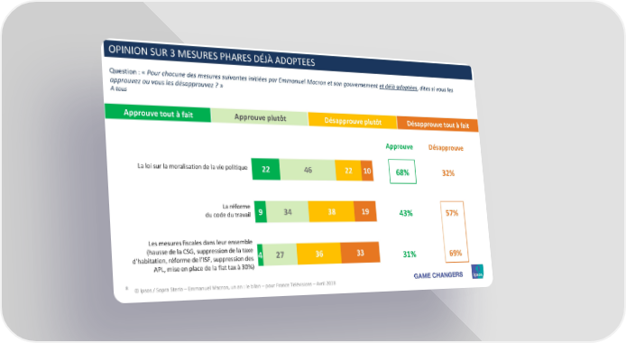 OPINIONSUR 3 MESURES PHARES DÉJÀ ADOPTEES Question : « Pour chacune des mesures suivantes initiées par Emmanuel Macron et son gouvernement et déjà adoptées, dites si vous les approuvez ou vous les désapprouvez ? » A tous Approuve tout à fait Approuve plutôt Désapprouve plutôt Désapprouve tout à fait Approuve Désapprouve La loi sur la moralisation de la vie politique 22 46 22 10 68% 32% La réforme 9 34 38 19 du code du travail 43% 57% Les mesures fiscales dans leur ensemble (hausse de la CSG, suppression de la taxe 4 27 36 33 d’habitation, réforme de l’ISF, suppression des 31% 69% APL, mise en place de la flat tax à 30%) 8 © Ipsos / Sopra Steria – Emmanuel Macron, un an : le bilan – pour France Télévisions – Avril 2018