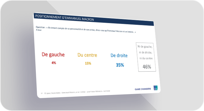 POSITIONNEMENT D’EMMANUELMACRON Question : « En tenant compte de sa personnalité et de son action, diriez-vous qu’Emmanuel Macron est un homme… » A tous Ni de gauche, De gauche Du centre De droite ni de droite, ni du centre 4% 15% 35% 46% 12 © Ipsos / Sopra Steria – Emmanuel Macron, un an : le bilan – pour France Télévisions – Avril 2018