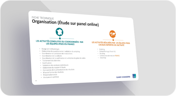 FICHE TECHNIQUE Organisation (Étude sur panel online) LES ACTIVITÉS CONDUITES OU COORDONNÉES PAR LES ACTIVITÉS RÉALISÉES PAR LES ÉQUIPES IPSOS LES ÉQUIPES IPSOS EN FRANCE LOCALES EXPERTES DE L’ACTIVITÉ • Design et méthodologie • Scripting • Elaboration du questionnaire / validation du scripting • Echantillonnage (Panel IIS) • Coordination et validation des traductions • Emailing • Coordination de la collecte • Collecte des données en FRANCE • Coordination de la codification et validation du plan de codes • Data Map • Traitement des données • Codification • Validation des analyses statistiques • Elaboration du rapport d’étude • Conception de la présentation des résultats • Mise en forme des résultats • Présentation orale • Analyses et synthèse 16