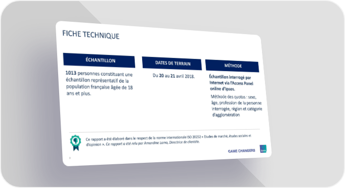 FICHE TECHNIQUE ÉCHANTILLON DATES DE TERRAIN MÉTHODE 1013personnes constituant une Du 20 au 21 avril 2018. Échantillon interrogé par échantillon représentatif de la Internet via l’Access Panel population française âgée de 18 online d’Ipsos. ans et plus. Méthode des quotas : sexe, âge, profession de la personne interrogée, région et catégorie d’agglomération Ce rapport a été élaboré dans le respect de la norme internationale ISO 20252 « Etudes de marché, études sociales et d’opinion». Ce rapport a été relu par Amandine Lama, Directrice de clientèle. 2