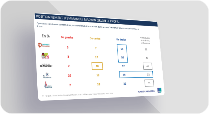 POSITIONNEMENTD’EMMANUEL MACRON (SELON LE PROFIL) Question : « En tenant compte de sa personnalité et de son action, diriez-vous qu’Emmanuel Macron est un homme… » A tous En % Ni de gauche, De gauche Du centre De droite ni de droite, ni du centre 3 7 65 25 3 17 54 26 2 40 12 46 10 18 39 33 7 10 32 51 13 © Ipsos / Sopra Steria – Emmanuel Macron, un an : le bilan – pour France Télévisions – Avril 2018