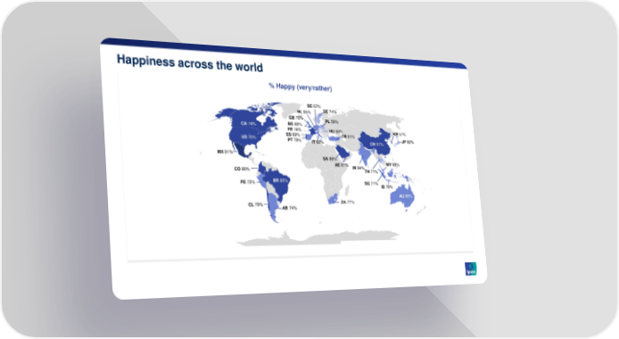 Happiness across the world % Happy (very/rather) DE67% NL85% SE74% GB70% PL58% CA74% BE68% FR74% HU50% KR57% US76% ES69% TR61% JP60% PT79% IT 68% CN91% MX81% SA86% AE 81% IN84% MY68% CO80% TH71% PE72% BR83% SG71% ID 79% AU 80% CL79% ZA77% AR 74%