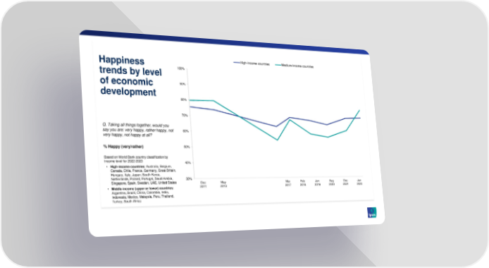 Happiness High-income countries Medium-income countries trends by level 100% of economic 90% development 80% 70% Q.Taking all things together, would you say you are: very happy, rather happy, not 60% very happy, not happy at all? % Happy (very/rather) 50% Based on World Bank country classification by income level for 2022-2023 40% • High-income countries: Australia, Belgium, Canada, Chile, France, Germany, Great Britain, Hungary, Italy, Japan, South Korea, Netherlands, Poland, Portugal, Saudi Arabia, 30% Singapore, Spain, Sweden, UAE, United States Dec May Mar Feb Jun Aug Dec Jan • Middle-income (upper or lower) countries: 2011 2013 2017 2018 2019 2020 2021 2023 Argentina, Brazil, China, Colombia, India, Indonesia, Mexico, Malaysia, Peru, Thailand, Turkey, South Africa