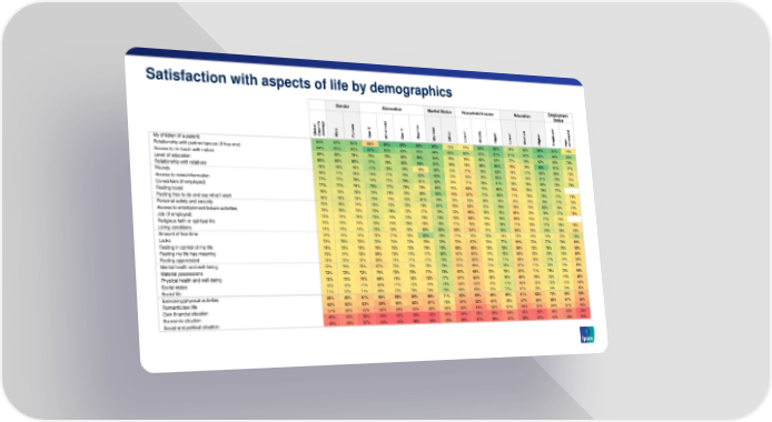 Satisfaction with aspects of life by demographics Gender Generation Marital Status Household Income Education Employment Status l r d d y e ia e e e l r g le n d m r y y a t a a Z n X m ie r r le r r e lo o b n r o r e d e iu h p - l o u e le m n le n r h we p we d n p v a e il Bo a o id o e m m GlCo A M F Ge M Ge M Ot L M Up L M Hig E Noe My children (if a parent) 85% 84% 85% 66% 89% 89% 89% 90% 75% 74% 86% 88% 79% 82% 89% 87% 74% Relationship with partner/spouse (if has one) 84% 85% 83% 82% 85% 83% 85% 84% 82% 80% 82% 87% 81% 83% 86% 84% 83% Access to /in touch with nature 80% 80% 79% 75% 79% 80% 86% 84% 76% 75% 80% 82% 77% 79% 82% 80% 78% Level of education 80% 80% 80% 77% 79% 80% 85% 84% 76% 73% 80% 85% 70% 76% 88% 81% 77% Relationship with relatives 78% 79% 78% 77% 79% 79% 78% 82% 75% 71% 79% 82% 72% 77% 82% 80% 75% Friends 78% 77% 78% 74% 77% 78% 83% 83% 73% 70% 78% 83% 73% 76% 81% 79% 75% Access to news/information 77% 77% 78% 74% 77% 79% 81% 82% 74% 71% 78% 81% 76% 76% 80% 78% 76% Co-workers (if employed) 77% 77% 76% 75% 77% 76% 79% 80% 74% 69% 77% 80% 70% 76% 79% 77% - Feeling loved 76% 75% 76% 73% 76% 75% 80% 83% 70% 67% 77% 80% 71% 75% 79% 77% 73% Feeling free to do and say what I want 76% 76% 75% 73% 74% 75% 81% 79% 73% 72% 76% 78% 73% 74% 78% 77% 73% Personal safety and security 75% 76% 74% 73% 75% 75% 79% 81% 70% 69% 75% 79% 70% 73% 80% 76% 74% Access to entertainment/leisure activities 75% 76% 73% 73% 76% 73% 77% 78% 72% 66% 76% 79% 69% 73% 78% 77% 70% Job (if employed) 74% 74% 75% 73% 74% 74% 79% 79% 70% 66% 74% 78% 69% 74% 77% 74% - Religious faith or spiritual life 74% 74% 74% 72% 74% 75% 75% 78% 71% 70% 73% 79% 71% 72% 77% 76% 70% Living conditions 74% 74% 74% 73% 73% 72% 80% 80% 69% 64% 74% 79% 68% 72% 78% 76% 70% Amount of free time 74% 74% 74% 70% 71% 72% 85% 78% 71% 72% 75% 74% 73% 74% 74% 72% 78% Looks 73% 75% 72% 72% 74% 73% 76% 78% 70% 67% 74% 77% 69% 72% 77% 76% 69% Feeling in control of my life 73% 73% 73% 70% 73% 73% 79% 79% 68% 66% 73% 78% 68% 72% 76% 76% 69% Feeling my life has meaning 73% 74% 72% 69% 73% 74% 77% 80% 67% 64% 74% 78% 69% 72% 76% 75% 69% Feeling appreciated 73% 73% 72% 69% 73% 71% 77% 79% 67% 63% 74% 77% 69% 70% 77% 74% 69% Mental health and well-being 72% 75% 70% 67% 72% 72% 79% 79% 67% 65% 71% 78% 67% 71% 76% 74% 69% Material possessions 72% 72% 72% 70% 72% 70% 77% 78% 67% 65% 73% 75% 67% 71% 75% 73% 69% Physical health and well-being 72% 73% 70% 69% 73% 72% 72% 77% 67% 65% 72% 76% 68% 70% 75% 74% 66% Social status 72% 72% 71% 68% 71% 72% 76% 79% 66% 63% 72% 77% 66% 70% 76% 75% 66% Social life 71% 72% 71% 69% 72% 70% 74% 78% 66% 63% 72% 77% 67% 70% 74% 74% 65% Exercising/physical activities 65% 69% 61% 65% 66% 63% 66% 71% 60% 59% 65% 69% 61% 62% 70% 68% 59% Romantic/sex life 63% 63% 63% 59% 68% 62% 61% 75% 54% 52% 64% 70% 57% 63% 66% 67% 55% Own financial situation 57% 60% 55% 56% 59% 55% 60% 66% 50% 44% 56% 67% 48% 55% 64% 61% 49% Economic situation 40% 43% 36% 44% 45% 35% 32% 46% 34% 38% 38% 44% 36% 35% 46% 43% 33% Social and political situation 40% 43% 37% 44% 44% 36% 32% 45% 36% 37% 39% 44% 36% 37% 44% 43% 34%