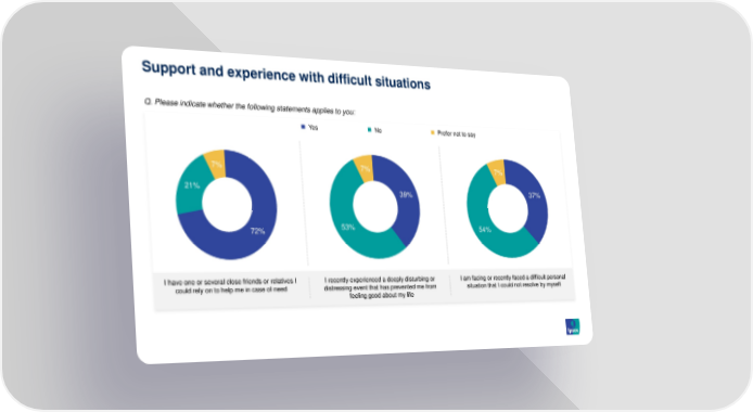 Support and experience with difficult situations Q. Please indicate whether the following statements applies to you: Yes No Prefer not to say 7% 7% 7% 21% 39% 37% 72% 53% 54% I have one or several close friends or relatives I I recently experienced a deeply disturbing or I am facing or recently faced a difficult personal could rely on to help me in case of need distressing event that has prevented me from situation that I could not resolve by myself feeling good about my life