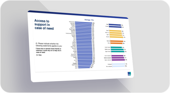 Average: 72% Access to Netherlands 82% Male 70% Indonesia 79% Portugal 79% Female 73% support in Poland 77% Argentina 77% case of need Saudi Arabia 76% Gen Z 69% Colombia 76% Millennial 71% Malaysia 75% United Arab Emirates 75% Gen X 71% Australia 74% Boomer 77% Mexico 74% Peru 74% Chile 73% Married 75% Spain 73% Thailand 73% Other 69% Q. Please indicate whether the Hungary 73% following statements applies to you: Belgium 72% South Africa 72% Lower income 64% I have one or several close friends or Germany 72% Middle income 73% relatives I could rely on to help me in Turkey 72% case of need Canada 71% Upper income 76% China 71% (% Yes) Great Britain 71% United States 71% Lower education 68% Sweden 70% Medium education 71% Italy 70% France 69% Higher education 75% India 68% Singapore 67% South Korea 61% Employed 73% Brazil 58% Non-employed 70% Japan 54%