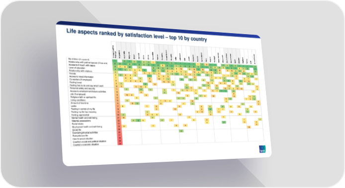 Life aspects ranked by satisfaction level – top 10 by country y r t a a s n in s ia e u a d b ic e t a e r r a a a y it ia n l r r f t Co e in a i n y s ia la a o n d S l t li m a b Br r A A Ko n g a d e a a e s o r d g i p e a y d a a n r iu a e a m c t g n n y ic e n u a h h d e e b r e t g zil o n m a ia o a la x h u t d g t t in e il k E o e g s a il in l a r e n d d ly p a e r la r u u u a a r it v r u r a a e o o a in o o p w h u Gl A A A Bel Br Can Ch Ch Co F Ge Gr Hu In In It J M M Net P P P S S S S S S T T UA Un My children (if a parent) 1 2 1 4 1 4 3 7 1 1 1 2 1 1 1 1 1 7 2 10 1 1 2 4 1 3 1 1 1 1 2 Relationship with partner/spouse (if has one) 2 2 1 3 1 2 3 2 1 2 6 2 1 4 3 2 2 2 3 1 1 3 5 3 5 1 2 1 6 4 2 1 Access to/in touch with nature 3 7 6 2 4 3 3 3 3 3 6 10 5 10 1 10 2 2 10 8 10 5 3 8 3 Level of education 3 1 3 5 6 6 1 2 5 2 9 8 6 8 5 10 6 4 9 8 3 5 5 2 9 2 4 6 4 Relationship with relatives 5 9 8 8 5 9 5 4 2 5 9 9 5 2 3 5 7 7 4 8 4 2 Friends 6 3 9 6 5 1 6 8 8 4 9 7 6 6 4 7 6 7 7 Access to news/information 7 8 6 5 9 10 7 4 2 3 4 5 4 3 2 8 2 9 10 Co-workers (if employed) 8 7 8 8 8 10 10 10 6 10 6 9 8 6 5 3 5 Feeling loved 9 5 2 10 5 5 3 4 10 10 4 8 Feeling free to do and say what I want 10 9 9 10 6 3 8 5 7 4 10 5 6 10 10 6 Personal safety and security 11 4 3 4 5 7 5 9 7 7 7 9 7 1 1 3 7 Access to entertainment/leisure activities 12 9 4 10 6 9 Job (if employed) 13 10 9 9 8 4 8 10 10 8 4 Religious faith or spiritual life 14 6 4 4 4 3 9 3 7 9 3 Living conditions 15 5 7 9 6 10 6 9 Amount of free time 15 10 3 8 7 4 4 9 Looks 17 6 7 9 9 8 5 3 6 9 6 Feeling in control of my life 18 8 10 9 2 7 7 5 Feeling my life has meaning 19 5 8 10 5 9 9 3 9 Feeling appreciated 20 4 9 6 6 8 8 6 Mental health and well-being 21 10 5 7 7 Material possessions 22 4 2 6 4 7 6 9 7 5 Social status 23 6 2 8 8 My physical health and well-being 23 8 7 9 9 9 Social life 25 10 Exercising/physical activities 26 3 Romantic/sex life 27 Own financial situation 28 Country’s social and political situation 29 Country’s economic situation 29