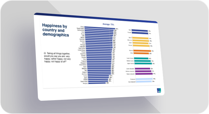 Average: 73% China 91% Happiness by China 91% Male 73% Saudi Arabia 86% Saudi Arabia 86% Netherlands 85% Female 74% Netherlands 85% India 84% country and India 84% Brazil 83% Brazil 83% UAE 81% Gen Z 73% demographics UAE 81% Mexico 81% Mexico 81% Millennial 75% Colombia 80% Colombia 80% Australia 80% Gen X 71% Australia 80% Chile 79% Chile 79% Portugal 79% Boomer 75% Portugal 79% Indonesia 79% Indonesia 79% South Africa 77% South Africa 77% United States 76% Married 79% United States 76% France 74% France 74% Other 68% Argentina 74% Argentina 74% Q. Taking all things together, Sweden 74% Sweden 74% would you say you are: very Canada 74% Canada 74% Lower income Peru 72% 64% happy, rather happy, not very Peru Thailand 72% 71% Middle income 74% Thailand Singapore 71% happy, not happy at all? 71% Great Britain Singapore 70% 71% Upper income 78% Spain Great Britain 69% 70% Malaysia 68% Spain 69% Italy 68% Malaysia 68% Lower education 68% Belgium 68% Italy 68% Medium education 72% Germany 67% Belgium 68% Turkey 61% Germany 67% Higher education 77% Japan 60% Turkey 61% Poland 58% Japan 60% South Korea 57% Poland 58% Employed 75% Hungary South Korea 50%57% Hungary 50% Non-employed 70%
