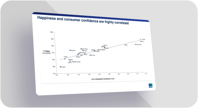 Happiness and consumer confidence are highly correlated 100% R² = 0.7622 90% China India Saudi Arabia Brazil 80% Mexico Australia South Africa Sweden United States % Happy Argentina France Canada (very/rather) 70% Great Britain Spain Italy Germany Turkey Belgium 60% Japan Poland South Korea 50% Hungary 40% 30.0 35.0 40.0 45.0 50.0 55.0 60.0 65.0 70.0 75.0 Ipsos Consumer Confidence Index