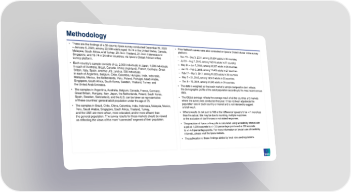 Methodology • These are the findings of a 32-country Ipsos survey conducted December 22, 2022 • Prior fieldwork waves were also conducted on Ipsos’s Global Advisor online survey –January 6, 2023, among 22,508 adults aged 18-74 in the United States, Canada, platform: Malaysia, South Africa, and Turkey, 20-74 in Thailand, 21-74 in Indonesia and – Nov 19 – Dec 3, 2021, among 20,504 adults in 30 countries Singapore, and 16-74 in 24 other countries, via Ipsos’s Global Advisor online – Jul 24 – Aug 7, 2020, among 19,516 adults in 27 countries survey platform. – May 24 – Jun 7, 2019, among 20,327 adults in 28 countries • Each country’s sample consists of ca. 2,000 individuals in Japan; 1,000 individuals – Jan 26 – Feb 9, 2018, among 19,428 adults in 27 countries in each of Australia, Brazil, Canada, China (mainland), France, Germany, Great Britain, Italy, Spain, and the U.S.; and ca. 500 individuals – Feb 17 – Mar 3, 2017, among 18,523 adults in 26 countries in each of Argentina, Belgium, Chile, Colombia, Hungary, India, Indonesia, – May 7 – 21, 2013, among 18,513 adults in 25 countries Malaysia, Mexico, the Netherlands, Peru, Poland, Portugal, Saudi Arabia, – Dec 6 – 19, 2011, among 21,245 adults in 24 countries Singapore, South Africa, South Korea, Sweden, Thailand, Turkey, and the United Arab Emirates. • The data is weighted so that each market’s sample composition best reflects • The samples in Argentina, Australia, Belgium, Canada, France, Germany, the demographic profile of the adult population according to the most recent census Great Britain, Hungary, Italy, Japan, the Netherlands, Poland, South Korea, data. Spain, Sweden, Switzerland, and the U.S. can be taken as representative • The Global average reflects the average result of all the countries and markets where the survey was conducted that year. It has not been adjusted to the of these countries’ general adult population under the age of 75. population size of each country or market and is not intended to suggest • The samples in Brazil, Chile, China, Colombia, India, Indonesia, Malaysia, Mexico, a total result. Peru, Saudi Arabia, Singapore, South Africa, Thailand, Turkey, • Where results do not sum to 100 or the ‘difference’ appears to be +/-1 more/less and the UAE are more urban, more educated, and/or more affluent than than the actual, this may be due to rounding, multiple responses the general population. The survey results for these markets should be viewed or the exclusion of don't knows or not stated responses. as reflecting the views of the more “connected” segment of their population. • The precision of Ipsos online polls is calculated using a credibility interval with a poll of 1,000 accurate to +/- 3.5 percentage points and of 500 accurate to +/- 4.8 percentage points. For more information on Ipsos’s use of credibility intervals, please visit the Ipsos website. • The publication of these findings abides by local rules and regulations.