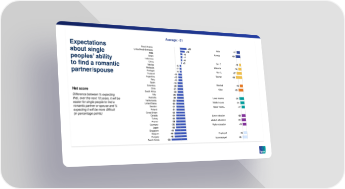 Average: -21 Expectations Saudi Arabia +26 Male -17 United Arab Emirates +18 about single India +8 Female -24 Brazil +7 Indonesia +6 peoples’ ability China +3 Gen Z -10 to find a romantic Mexico -6 Millennial -16 Malaysia -7 partner/spouse Portugal -8 Gen X -27 Thailand -14 Boomer -32 Argentina -15 Peru -15 Spain -19 Married -16 Colombia -20 Net score Chile -21 Other -25 South Africa -22 Difference between % expecting Italy -26 that, over the next 10 years, it will be Australia -26 Lower income -24 easier for single people to find a Netherlands -28 Middle income -21 romantic partner or spouse and % United States -30 Sweden -31 Upper income -17 expecting it will be more difficult Poland -31 (in percentage points) Great Britain -33 Canada -34 Lower education -20 Turkey -35 Medium education -23 France -36 Germany -38 Higher education -19 Japan -38 Singapore -43 Belgium -46 Employed -18 Hungary -46 Non-employed -26 South Korea -58