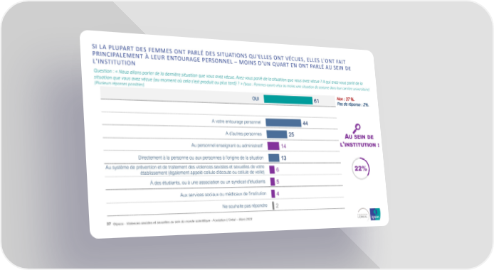 SI LA PLUPART DES FEMMES ONT PARLÉ DES SITUATIONS QU'ELLES ONT VÉCUES, ELLES L'ONT FAIT PRINCIPALEMENT À LEUR ENTOURAGE PERSONNEL – MOINS D'UN QUART EN ONT PARLÉ AU SEIN DE L'INSTITUTION Question : « Nous allons parler de la dernière situation que vous avez vécue. Avez-vous parlé de la situation que vous avez vécue ? A qui avez-vous parlé de la situation que vous avez vécue (au moment où cela s'est produit ou plus tard) ? » (base : Femmes ayant vécu au moins une situation de sexisme dans leur carrière universitaire) [Plusieurs réponses possibles] OUI 61 Non : 37 %. Pas de réponse : 2%. A votre entourage personnel 44 A d’autres personnes 25 AUSEIN DE Au personnel enseignant ou administratif 14 L'INSTITUTION : Directement à la personne ou aux personnes à l’origine de la situation 13 Au système de prévention et de traitement des violences sexistes et sexuelles de votre 6 22% établissement (également appelé cellule d'écoute ou cellule de veille) À des étudiants, ou à une association ou un syndicat d'étudiants 5 Aux services sociaux ou médicaux de l'institution 4 Ne souhaite pas répondre 2 37 ©Ipsos - Violences sexistes et sexuelles au sein du monde scientifique - Fondation L'Oréal -- Mars 2023