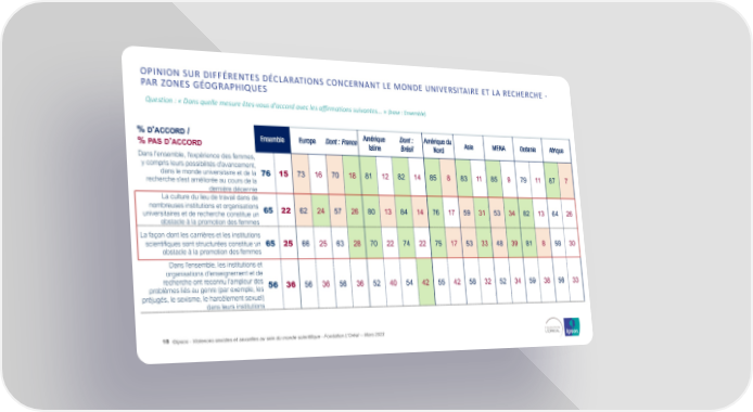 OPINION SUR DIFFÉRENTES DÉCLARATIONS CONCERNANT LE MONDE UNIVERSITAIRE ET LA RECHERCHE - PAR ZONES GÉOGRAPHIQUES Question : « Dans quelle mesure êtes-vous d'accord avec les affirmations suivantes... » (base : Ensemble) % D'ACCORD / Ensemble Europe Dont : France Amérique Dont : Amérique du Asie MENA Océanie Afrique % PAS D’ACCORD latine Brésil Nord Dans l'ensemble, l'expérience des femmes, y compris leurs possibilités d'avancement, dans le monde universitaire et de la 76 15 73 16 70 18 81 12 82 14 85 8 83 11 85 9 79 11 87 7 recherche s'est améliorée au cours de la dernière décennie La culture du lieu de travail dans de nombreuses institutions et organisations 65 22 62 24 57 26 80 13 84 14 76 17 59 31 53 34 82 13 64 26 universitaires et de recherche constitue un obstacle à la promotion des femmes La façon dont les carrières et les institutions scientifiques sont structurées constitue un 65 25 66 25 63 28 70 22 74 22 75 17 53 33 48 39 81 8 58 30 obstacle à la promotion des femmes Dans l'ensemble, les institutions et organisations d'enseignement et de recherche ont reconnu l'ampleur des 56 36 56 36 56 36 52 40 54 42 55 42 58 32 52 34 59 38 56 33 problèmes liés au genre (par exemple, les préjugés, le sexisme, le harcèlement sexuel) dans leurs institutions 18 ©Ipsos - Violences sexistes et sexuelles au sein du monde scientifique - Fondation L'Oréal -- Mars 2023