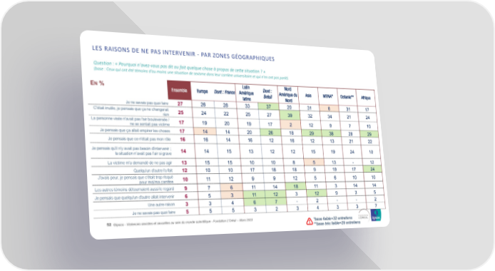 LES RAISONS DE NE PAS INTERVENIR - PAR ZONES GÉOGRAPHIQUES Question : « Pourquoi n'avez-vous pas dit ou fait quelque chose à propos de cette situation ? » (base : Ceux qui ont été témoins d'au moins une situation de sexisme dans leur carrière universitaire et qui n'en ont pas parlé). EN% Latin Dont : Nord Ensemble Europe Dont : France Amérique Brésil Amérique du Asie MENA* Océanie** Afrique latine Nord Je ne savais pas quoi faire 27 26 28 33 37 20 31 6 31 17 C'était inutile, je pensais que ça ne changerait 25 24 22 25 27 39 32 34 21 24 rien La personne visée n'avait pas l'air bouleversée / 17 19 20 19 17 2 12 9 7 10 ne se sentait pas victime Je pensais que ça allait empirer les choses 17 14 14 20 26 18 29 38 28 29 Je pensais que ce n'était pas mon rôle 16 16 14 16 12 16 12 13 21 22 Je pensais qu'il n'y avait pas besoin d'intervenir ; 14 14 15 13 12 12 15 19 24 10 la situation n’avait pas l’air si grave La victime m'a demandé de ne pas agir 13 15 15 10 10 8 5 13 - 12 Quelqu'un d'autre l'a fait 12 10 10 17 18 18 9 19 17 24 J'avais peur, je pensais que c'était trop risqué 10 11 12 9 9 12 5 6 10 10 pour moi/ma carrière Les autres témoins détournaient aussi le regard 9 7 6 11 14 18 11 3 14 14 Je pensais que quelqu'un d'autre allait intervenir 6 5 3 11 12 3 12 9 3 5 Une autre raison 3 3 4 6 7 - 2 - - 2 Je ne savais pas quoi faire 5 5 5 3 2 3 4 3 3 7 52 ©Ipsos - Violences sexistes et sexuelles au sein du monde scientifique - Fondation L'Oréal -- Mars 2023 *base faible=32 entretiens **base très faible=29 entretiens