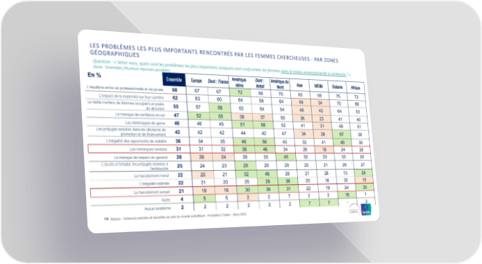 LES PROBLÈMES LES PLUS IMPORTANTS RENCONTRÉS PAR LES FEMMES CHERCHEUSES - PAR ZONES GÉOGRAPHIQUES Question : « Selon vous, quels sont les problèmes les plus importants auxquels sont confrontées les femmes dans le milieu universitaire/de la recherche ? » (base : Ensemble) [Plusieurs réponses possibles] EN% Ensemble Europe Dont : France Amérique Dont : Amérique du Asie MENA Océanie Afrique latine Brésil Nord L’équilibre entre vie professionnelle et vie privée 68 67 67 72 68 70 65 59 75 72 L’impact de la maternité sur leur carrière 62 63 60 64 59 64 49 34 70 66 Le faible nombre de femmes occupant un poste 55 57 58 52 54 54 48 43 64 53 de direction Le manque de confiance en soi 47 52 55 38 37 50 36 23 41 40 Les stéréotypes de genre 46 46 45 51 56 52 41 31 49 51 Les préjugés sexistes dans les décisions de 42 42 42 44 42 47 34 28 67 38 promotion et de financement L’inégalité des opportunité de visibilité 36 34 35 48 56 40 32 41 49 36 Les remarques sexistes 31 31 32 38 46 34 26 18 24 28 Le manque de respect en general 28 26 24 28 33 45 32 23 33 25 L’accès à l'emploi, les préjugés sexistes à 25 24 23 29 29 29 25 21 29 27 l'embauche Le harcèlement moral 22 20 21 32 48 28 21 26 13 29 L’inégalité salariale 22 21 20 25 28 36 20 16 32 15 Le harcèlement sexuel 21 18 18 30 36 31 22 19 24 30 Autre 4 5 5 2 2 7 2 2 18 1 Aucun problème 2 2 2 2 2 2 7 7 - 3 14 ©Ipsos - Violences sexistes et sexuelles au sein du monde scientifique - Fondation L'Oréal -- Mars 2023