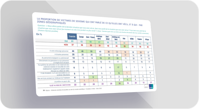 LA PROPORTION DE VICTIMES DE SEXISME QUI ONT PARLÉ DE CE QU'ELLES ONT VÉCU, ET À QUI - PAR ZONES GÉOGRAPHIQUES Question : « Nous allons parler de la dernière situation que vous avez vécue. Avez-vous parlé de la situation que vous avez vécue ? A qui avez-vous parlé de la situation que vous avez vécue (au moment où cela s'est produit ou plus tard) ? » (base : Femmes ayant vécu au moins une situation de sexisme dans leur carrière universitaire) [Plusieurs réponses possibles] EN% Ensemble Europe Dont : France Amérique Dont : Amérique du Asie MENA Océanie Afrique latine Brésil Nord OUI 61 62 66 67 56 55 44 57 50 55 NON 37 36 32 31 42 44 53 34 50 42 A votre entourage personnel 44 48 55 49 36 33 18 38 20 37 A d’autres personnes 25 26 26 23 19 25 17 14 28 22 Au personnel enseignant ou administratif 14 13 14 18 21 25 11 20 10 16 Directement à la personne ou aux personnes 13 13 14 12 11 17 8 11 18 17 à l’origine de la situation Au système de prévention et de traitement des violences sexistes et sexuelles de votre 6 5 5 6 4 17 5 7 3 4 établissement (également appelé cellule d'écoute ou cellule de veille). À des étudiants, ou à une association ou un 5 5 6 5 7 10 1 - - 4 syndicat d'étudiants Aux services sociaux ou médicaux de l'institution 4 5 6 2 3 2 3 2 5 1 Je préfère ne pas le dire 2 1 1 1 - 2 5 4 3 1 AUSEINDELINSTITUTION % ST ' 22 22 24 23 25 36 16 25 15 21 38 ©Ipsos - Violences sexistes et sexuelles au sein du monde scientifique - Fondation L'Oréal -- Mars 2023