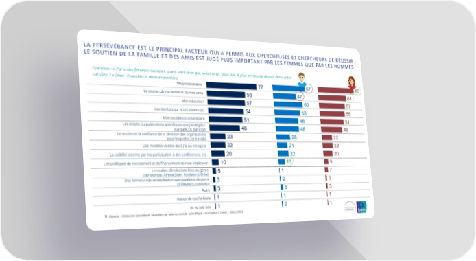 LA PERSÉVÉRANCE EST LE PRINCIPAL FACTEUR QUI A PERMIS AUX CHERCHEUSES ET CHERCHEURS DE RÉUSSIR ; LE SOUTIEN DE LA FAMILLE ET DES AMIS EST JUGÉ PLUS IMPORTANT PAR LES FEMMES QUE PAR LES HOMMES Question : « Parmi les facteurs suivants, quels sont ceux qui, selon vous, vous ont le plus permis de réussir dans votre carrière ? » (base : Ensemble) [6 réponses possibles] Ma persévérance 77 67 80 Le soutien de ma famille et de mes amis 58 47 61 Mon éducation 57 60 57 Les mentors qui m'ont soutenu(e) 54 53 55 Mon excellence universitaire 51 48 51 Les projets ou publications spécifiques que j'ai dirigés / 46 48 46 auxquels j'ai participé Le soutien et la confiance de la direction des organisations 23 28 22 pour lesquelles j'ai travaillé Des modèles visibles dont j’ai pu m'inspirer 22 21 22 La visibilité externe par ma participation à des conférences, etc. 20 22 20 Les politiques de recrutement et de financement de mon employeur 10 13 9 Le soutien d'institutions liées au genre 5 1 7 (par exemple, Athena Swan, Fondation L'Oréal) Des formation de sensibilisation aux questions de genre 3 2 3 et initiatives connexes 3 5 3 Autre Aucunde ces facteurs 1 1 1 Je ne sais pas 1 2 1 9 ©Ipsos - Violences sexistes et sexuelles au sein du monde scientifique - Fondation L'Oréal -- Mars 2023