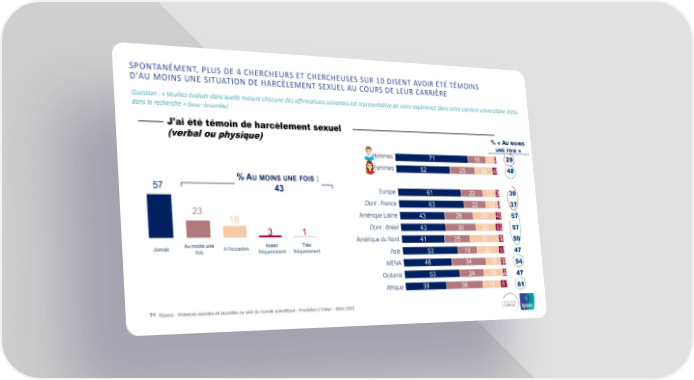 SPONTANÉMENT, PLUS DE 4 CHERCHEURS ET CHERCHEUSES SUR 10 DISENT AVOIR ÉTÉ TÉMOINS D'AU MOINS UNE SITUATION DE HARCÈLEMENT SEXUEL AU COURS DE LEUR CARRIÈRE Question : « Veuillez évaluer dans quelle mesure chacune des affirmations suivantes est représentative de votre expérience dans votre carrière universitaire et/ou dans la recherche » (base : Ensemble) J'ai été témoin de harcèlement sexuel (verbal ou physique) % «AUMOINS UNE FOIS » Hommes 71 18 9 2 29 Femmes 52 25 18 41 48 57 % AUMOINSUNEFOIS: 43 Europe 61 22 13 31 39 Dont : France 63 22 12 21 37 23 16 Amérique Latine 43 28 23 42 57 3 1 Dont : Brésil 43 30 20 52 57 Au moins une Assez Très Amérique du Nord 41 25 29 32 59 Jamais fois A l'occasion fréquemment fréquemment Asie 53 19 22 51 47 MENA 46 34 15 32 54 Océanie 53 24 19 22 47 Afrique 39 36 18 61 61 71 ©Ipsos - Violences sexistes et sexuelles au sein du monde scientifique - Fondation L'Oréal -- Mars 2023
