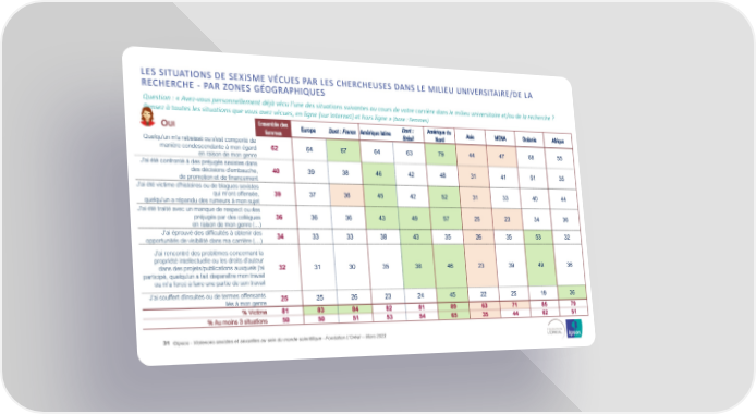 LES SITUATIONS DE SEXISME VÉCUES PAR LES CHERCHEUSES DANS LE MILIEU UNIVERSITAIRE/DE LA RECHERCHE - PAR ZONES GÉOGRAPHIQUES Question : « Avez-vous personnellement déjà vécu l'une des situations suivantes au cours de votre carrière dans le milieu universitaire et/ou de la recherche ? Pensez à toutes les situations que vous avez vécues, en ligne (sur Internet) et hors ligne » (base : Femmes) OUI Ensemble des Europe Dont : France Amérique latine Dont : Amérique du Asie MENA Océanie Afrique femmes Brésil Nord Quelqu'un m'a rabaissé ou s'est comporté de manière condescendante à mon égard 62 64 67 64 63 79 44 47 68 55 en raison de mon genre J'ai été confronté à des préjugés sexistes dans des décisions d'embauche, 40 39 38 46 42 48 31 41 51 35 de promotion et de financement J'ai été victime d'histoires ou de blagues sexistes qui m'ont offensée, 39 37 36 45 42 52 31 33 40 44 quelqu'un a répandu des rumeurs à mon sujet J'ai été traité avec un manque de respect ou des préjugés par des collègues 36 36 36 43 49 57 25 23 34 36 en raison de mon genre (...) J'ai éprouvé des difficultés à obtenir des 34 33 33 38 43 35 26 35 53 32 opportunités de visibilité dans ma carrière (…) J'ai rencontré des problèmes concernant la propriété intellectuelle ou les droits d'auteur dans des projets/publications auxquels j'ai 32 31 30 35 38 46 23 39 49 36 participé, quelqu'un a fait disparaître mon travail ou m'a forcé à faire une partie de son travail J'ai souffert d'insultes ou de termes offensants 25 25 26 23 24 45 22 25 19 36 liés à mon genre % Victime 81 83 84 82 81 89 63 71 85 79 % Au moins 3 situations 50 50 51 53 54 65 35 44 62 51 31 ©Ipsos - Violences sexistes et sexuelles au sein du monde scientifique - Fondation L'Oréal -- Mars 2023