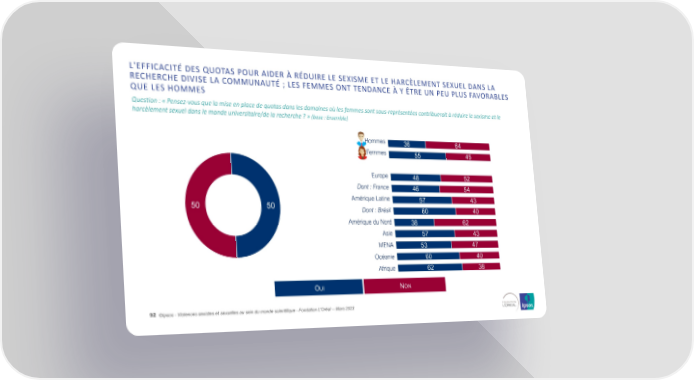 L'EFFICACITÉ DES QUOTAS POUR AIDER À RÉDUIRE LE SEXISME ET LE HARCÈLEMENT SEXUEL DANS LA RECHERCHE DIVISE LA COMMUNAUTÉ ; LES FEMMES ONT TENDANCE À Y ÊTRE UN PEU PLUS FAVORABLES QUE LES HOMMES Question : « Pensez-vous que la mise en place de quotas dans les domaines où les femmes sont sous-représentées contribuerait à réduire le sexisme et le harcèlement sexuel dans le monde universitaire/de la recherche ? » (base : Ensemble) Hommes 36 64 Femmes 55 45 Europe 48 52 Dont : France 46 54 Amérique Latine 57 43 50 50 Dont : Brésil 60 40 Amérique du Nord 38 62 Asie 57 43 MENA 53 47 Océanie 60 40 Afrique 62 38 OUI NON 92 ©Ipsos - Violences sexistes et sexuelles au sein du monde scientifique - Fondation L'Oréal -- Mars 2023
