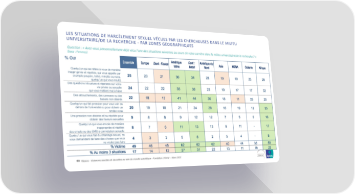 LES SITUATIONS DE HARCÈLEMENT SEXUEL VÉCUES PAR LES CHERCHEUSES DANS LE MILIEU UNIVERSITAIRE/DE LA RECHERCHE - PAR ZONES GÉOGRAPHIQUES Question : « Avez-vous personnellement déjà vécu l'une des situations suivantes au cours de votre carrière dans le milieu universitaire/de la recherche ? » (base : Femmes) % OUI Ensemble Europe Dont : France Amérique Dont : Amérique du Asie MENA Océanie Afrique latine Brésil Nord Quelqu’un qui se réfère à vous de manière inappropriée et répétée, qui vous appelle par 25 23 21 36 34 28 19 19 23 28 exemple poupée, bébé, minette ou nana, quelqu’un qui vous insulte Des questions intrusives et répétées sur votre vie privée ou sexuelle 24 22 22 35 36 23 19 17 17 32 qui vous mettent mal à l'aise Des attouchements, des caresses ou des 22 18 13 41 44 36 18 11 23 25 baisers non désirés Quelqu’un qui fait pression pour vous voir en dehors de l’université ou pour obtenir un 20 19 18 21 24 28 16 19 19 35 rendez-vous Une pression non désirée et/ou répétée pour 9 8 8 9 12 12 7 5 9 16 obtenir des faveurs sexuelles Quelqu’un qui vous envoie de manière inappropriée et répétée 8 7 6 11 13 13 9 11 - 17 des emails ou des SMS à connotation sexuelle Quelqu’un qui vous fait du chantage sexuel, en vous demandant de faire des choses que vous 4 3 3 5 8 2 5 4 - 8 ne voulez pas faire % Victime 49 46 45 62 62 62 40 44 38 59 % Au moins 3 situations 17 14 12 27 31 22 13 11 19 25 60 ©Ipsos - Violences sexistes et sexuelles au sein du monde scientifique - Fondation L'Oréal -- Mars 2023