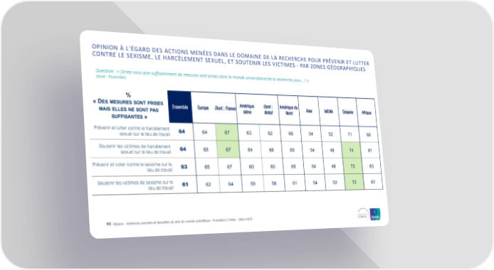 OPINION À L'ÉGARD DES ACTIONS MENÉES DANS LE DOMAINE DE LA RECHERCHE POUR PRÉVENIR ET LUTTER CONTRELE SEXISME, LE HARCÈLEMENT SEXUEL, ET SOUTENIR LES VICTIMES - PAR ZONES GÉOGRAPHIQUES Question : « Diriez-vous que suffisamment de mesures sont prises dans le monde universitaire/de la recherche pour... ? » (base : Ensemble) % « DES MESURES SONT PRISES Ensemble Europe Dont : France Amérique Dont : Amérique du Asie MENA Océanie Afrique MAIS ELLES NE SONT PAS latine Brésil Nord SUFFISANTES » Prévenir et lutter contre le harcèlement 64 64 67 63 62 68 54 52 71 68 sexuel sur le lieu de travail Soutenir les victimes de harcèlement 64 65 67 64 66 65 54 48 74 61 sexuel sur le lieu de travail Prévenir et lutter contre le sexisme sur le 63 65 67 60 60 65 54 48 73 63 lieu de travail Soutenir les victimes de sexisme sur le 61 62 64 59 58 61 54 52 72 62 lieu de travail 82 ©Ipsos - Violences sexistes et sexuelles au sein du monde scientifique - Fondation L'Oréal -- Mars 2023