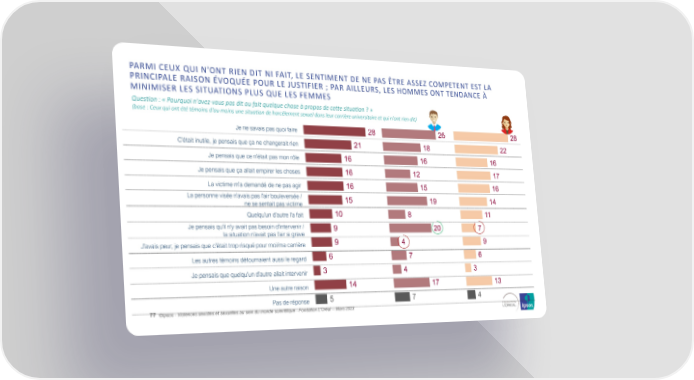 PARMI CEUX QUI N’ONT RIEN DIT NI FAIT, LE SENTIMENT DE NE PAS ÊTRE ASSEZ COMPETENT EST LA PRINCIPALE RAISON ÉVOQUÉE POUR LE JUSTIFIER ; PAR AILLEURS, LES HOMMES ONT TENDANCE À MINIMISER LES SITUATIONS PLUS QUE LES FEMMES Question : « Pourquoi n'avez-vous pas dit ou fait quelque chose à propos de cette situation ? » (base : Ceux qui ont été témoins d'au moins une situation de harcèlement sexuel dans leur carrière universitaire et qui n'ont rien dit) Je ne savais pas quoi faire 28 26 28 C'était inutile, je pensais que ça ne changerait rien 21 18 22 Je pensais que ce n'était pas mon rôle 16 16 16 Je pensais que ça allait empirer les choses 16 12 17 La victime m'a demandé de ne pas agir 16 15 16 La personne visée n’avais pas l'air bouleversée / 15 19 14 ne se sentait pas victime Quelqu'un d'autre l'a fait 10 8 11 Je pensais qu'il n'y avait pas besoin d'intervenir / 9 20 7 la situation n’avait pas l’air si grave J'avais peur, je pensais que c'était trop risqué pour moi/ma carrière 9 4 9 Les autres témoins détournaient aussi le regard 6 7 6 Je pensais que quelqu'un d'autre allait intervenir 3 4 3 Une autre raison 14 17 13 Pas de réponse 5 7 4 77 ©Ipsos - Violences sexistes et sexuelles au sein du monde scientifique - Fondation L'Oréal -- Mars 2023