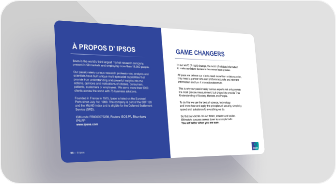 À PROPOS D’ IPSOS GAME CHANGERS Ipsos is the world’s third largest market research company, In our world of rapid change, the need of reliable information present in 90 markets and employing more than 18,000 people. to make confident decisions has never been greater. Our passionately curious research professionals, analysts and At Ipsos we believe our clients need more than a data supplier, scientists have built unique multi-specialist capabilities that they need a partner who can produce accurate and relevant provide true understanding and powerful insights into the information and turn it into actionable truth. actions, opinions and motivations of citizens, consumers, patients, customers or employees. We serve more than 5000 This is why our passionately curious experts not only provide clients across the world with 75 business solutions. the most precise measurement, but shape it to provide True Understanding of Society, Markets and People. Founded in France in 1975, Ipsos is listed on the Euronext Paris since July 1st, 1999. The company is part of the SBF 120 To do this we use the best of science, technology and the Mid-60 index and is eligible for the Deferred Settlement and know-how and apply the principles of security, simplicity, Service (SRD). speed and substance to everything we do. ISIN code FR0000073298, Reuters ISOS.PA, Bloomberg So that our clients can act faster, smarter and bolder. IPS:FP Ultimately, success comes down to a simple truth: www.ipsos.com You act better when you are sure. 95‒ ©© IIppsososs