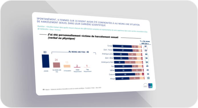 SPONTANÉMENT, 4 FEMMES SUR 10 DISENT AVOIR ÉTÉ CONFRONTÉES À AU MOINS UNE SITUATION DE HARCÈLEMENT SEXUEL DANS LEUR CARRIÈRE SCIENTIFIQUE Question : «Veuillez évaluer dans quelle mesure chacune des affirmations suivantes est représentative de votre expérience dans votre carrière universitaire et/ou de recherche » (base : Femmes) J'ai été personnellement victime de harcèlement sexuel (verbal ou physique) % «AUMOINS UNE FOIS » Europe 65 22 11 2 35 Dont : France 67 21 102 33 60 AUMOINSUNEFOIS: 40 Amérique Latine 50 28 18 31 50 24 Dont : Brésil 50 29 16 32 50 13 Amérique du Nord 36 37 23 22 64 2 1 Asie 60 21 15 31 40 Jamais Au moins une A l'occasion Assez Très MENA 58 35 43 42 fois fréquemment fréquemment Océanie 68 16 9 52 32 Afrique 47 36 15 2 53 58 ©Ipsos - Violences sexistes et sexuelles au sein du monde scientifique - Fondation L'Oréal -- Mars 2023
