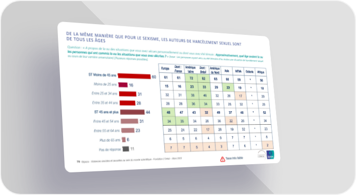 DE LA MÊMEMANIÈRE QUE POUR LE SEXISME, LES AUTEURS DE HARCÈLEMENT SEXUEL SONT DE TOUS LES ÂGES Question : « A propos de la ou des situations que vous avez vécues personnellement ou dont vous avez été témoin : Approximativement, quel âge avaient la ou les personnes qui ont commis la ou les situations que vous avez décrites ? » (base : Les personnes ayant vécu ou été témoins d'au moins une situation de harcèlement sexuel au cours de leur carrière universitaire) [Plusieurs réponses possibles]. Europe Dont : Amérique Dont : Amérique Asie MENA Océanie Afrique France latine Brésil du Nord ST Moins de 45 ans 60 61 61 72 82 65 66 59 * 56 Moins de 25 ans 16 15 16 23 33 20 22 19 * 10 Entre 25 et 34 ans 31 32 31 38 46 32 26 17 * 29 Entre 35 et 44 ans 28 28 28 36 34 33 29 32 * 25 ST 45 ans et plus 44 48 47 43 32 49 37 48 * 52 Entre 45 et 54 ans 31 34 35 34 26 36 22 26 * 34 Entre 55 et 64 ans 23 25 24 22 17 26 19 32 * 23 Plus de 65 ans 6 6 5 6 4 9 7 7 * 8 Pas de réponse 11 7 7 5 4 3 7 6 * 2 79 ©Ipsos - Violences sexistes et sexuelles au sein du monde scientifique - Fondation L'Oréal -- Mars 2023 *base très faible