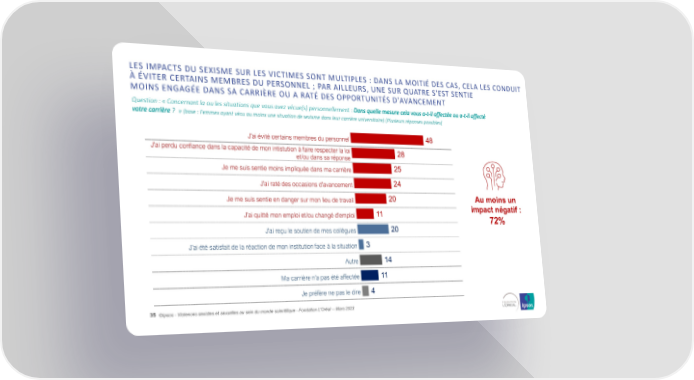LES IMPACTS DU SEXISME SUR LES VICTIMES SONT MULTIPLES : DANS LA MOITIÉ DES CAS, CELA LES CONDUIT À ÉVITER CERTAINS MEMBRES DU PERSONNEL ; PAR AILLEURS, UNE SUR QUATRE S'EST SENTIE MOINSENGAGÉE DANS SA CARRIÈRE OU A RATÉ DES OPPORTUNITÉS D'AVANCEMENT Question : « Concernant la ou les situations que vous avez vécue(s) personnellement : Dans quelle mesure cela vous a-t-il affectée ou a-t-il affecté votre carrière ? » (base : Femmes ayant vécu au moins une situation de sexisme dans leur carrière universitaire) [Plusieurs réponses possibles] J'ai évité certains membres du personnel 48 J'ai perdu confiance dans la capacité de mon intistution à faire respecter la loi 28 et/ou dans sa réponse Je me suis sentie moins impliquée dans ma carrière 25 J'ai raté des occasions d'avancement 24 Je me suis sentie en danger sur mon lieu de travail 20 Au moins un J'ai quitté mon emploi et/ou changé d'emploi 11 impact négatif : 20 72% J'ai reçu le soutien de mes collègues J'ai été satisfait de la réaction de mon institution face à la situation 3 Autre 14 Ma carrière n'a pas été affectée 11 Je préfère ne pas le dire 4 35 ©Ipsos - Violences sexistes et sexuelles au sein du monde scientifique - Fondation L'Oréal -- Mars 2023