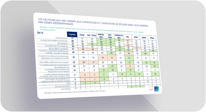 LES FACTEURS QUI ONT PERMIS AUX CHERCHEUSES ET CHERCHEURS DE RÉUSSIR DANS LEUR CARRIÈRE - PAR ZONES GÉOGRAPHIQUES Question : « Parmi les facteurs suivants, quels sont ceux qui, selon vous, vous ont le plus permis de réussir dans votre carrière ? » (base : Ensemble) [6 réponses possibles] EN% Ensemble Europe Dont : France Amérique Dont : Amérique du Asie MENA Océanie Afrique latine Brésil Nord Ma persévérance 77 77 78 81 83 86 67 76 84 77 Le soutien de ma famille et de mes amis 58 56 56 66 68 63 61 62 70 64 Mon éducation 57 58 62 65 67 50 45 53 48 54 Les mentors qui m'ont soutenu(e) 54 55 54 53 54 76 58 41 65 51 Mon excellence universitaire 51 48 48 53 52 62 61 58 60 66 Les projets ou publications spécifiques que 46 48 48 48 52 47 39 38 64 41 j'ai dirigés / auxquels j'ai participé Le soutien et la confiance de la direction des 23 24 24 18 12 21 31 27 27 17 organisations pour lesquelles j'ai travaillé Des modèles visibles dont j’ai pu m'inspirer 22 20 17 25 22 23 31 26 35 32 La visibilité externe par ma participation à 20 21 22 23 27 18 11 25 29 30 des conférences, etc. Les politiques de recrutement et de 10 9 9 13 16 5 18 8 3 9 financement de mon employeur Le soutien d'institutions liées au genre 5 4 2 7 3 10 8 13 8 22 (par exemple, Athena Swan, Fondation L'Oréal) Des formation de sensibilisation aux 3 2 1 5 4 5 4 2 6 3 questions de genre et initiatives connexes Autre 3 4 4 4 4 1 2 2 6 3 Aucunde ces facteurs 1 1 - - - - 1 2 - 1 Je ne sais pas 1 1 - - - - 4 4 - 2 10 ©Ipsos - Violences sexistes et sexuelles au sein du monde scientifique - Fondation L'Oréal -- Mars 2023