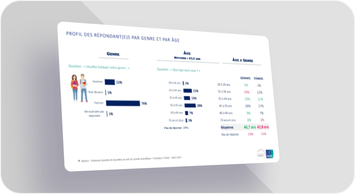 PROFIL DES RÉPONDANT(E)S PAR GENRE ET PAR ÂGE ÂGE GENRE MOYENNE : 43,5 ANS ÂGE X GENRE Question : « Veuillez indiquer votre genre : » Question : « Quel âge avez-vous ? » OMMES EMMES H F Homme 22% 18 à 24 ans 2% 18 à 24 ans 3% 2% 25 à 34 ans 21% 25 à 34 ans 16% 22% Non Binaire 1% 35 à 44 ans 15% 35 à 44 ans 19% 27% Femme 76% 45 à 59 ans 28% 45 à 59 ans 28% 27% Ne souhaite pas 1% 60 à 69 ans 7% 60 à 69 ans 9% 7% répondre 70 ans et plus 3% 70 ans et plus 6% 2% Pas de réponse : 24%. Moyenne 46,7 ans 42,8 ans Pas de réponse 19% 13% 4 ©Ipsos - Violences sexistes et sexuelles au sein du monde scientifique - Fondation L'Oréal -- Mars 2023