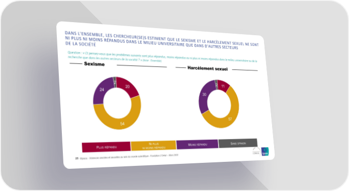 DANS L'ENSEMBLE, LES CHERCHEUR(SE)S ESTIMENT QUE LE SEXISME ET LE HARCÈLEMENT SEXUEL NE SONT NI PLUS NI MOINS RÉPANDUS DANS LE MILIEU UNIVERSITAIRE QUE DANS D'AUTRES SECTEURS DE LA SOCIÉTÉ Question : « Et pensez-vous que les problèmes suivants sont plus répandus, moins répandus ou ni plus ni moins répandus dans le milieu universitaire ou de la recherche que dans les autres secteurs de la société ? » (base : Ensemble) Sexisme Harcèlement sexuel 2 20 2 11 24 30 54 57 PLUS RÉPANDU NI PLUS MOINSRÉPANDU SANSOPINION NI MOINS RÉPANDU 25 ©Ipsos - Violences sexistes et sexuelles au sein du monde scientifique - Fondation L'Oréal -- Mars 2023