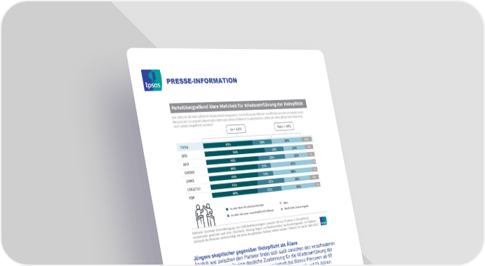 PRESSE-INFORMATION Jüngere skeptischer gegenüber Wehrpflicht als Ältere Ähnlich wie zwischen den Parteien findet sich auch zwischen den verschiedenen Altersgruppen jeweils eine deutliche Zustimmung für die Wiedereinführung der Wehrpflicht bzw. des Zivildiensts. Diese ist jedoch bei älteren Personen ab 60 Jahren höher als bei jüngeren Wahlberechtigten zwischen 18 und 39 Jahren. Unter den Älteren ist vor allem der Anteil derjenigen, die sich für eine geschlechtsunabhängige Wehrpflicht aussprechen, mit 47 Prozent deutlich höher als bei den Jüngeren (39%). Die Ablehnung der Wehrpflicht ist bei beiden Altersgruppen eine Minderheitenposition, auch wenn sich die Jüngeren (33%) deutlich skeptischer gegenüber der Dienstpflicht äußern als dies bei den Älteren der Fall ist, von denen nur ein Fünftel (22%) die Wiedereinführung ablehnt. Geschlechtsunabhängige Wehrpflicht bei Männern beliebter als bei Frauen Sowohl Männer als auch Frauen würden die Neuauflage der Dienstpflicht mehrheitlich begrüßen. Bemerkenswert ist jedoch, dass unter Frauen der Anteil derjenigen, die sich für eine geschlechtsunabhängige Dienstpflicht aussprechen, mit 36 Prozent deutlich geringer als bei den männlichen Befragten. Fast jeder zweite Mann (49%) würde einen Wehr- und Zivildient für alle Geschlechter bevorzugen. Im Umkehrschluss ist bei den weiblichen Befragten der Anteil derjenigen etwas größer, die in Sachen Wehr- und Zivildienst ausschließlich Männer in der Pflicht sehen (21% bei Frauen, 15% bei Männern). Ipsos GmbH Kontakt: Gudrun Witt, Sachsenstraße 6 Manager Communications 20097 Hamburg E-Mail: [email protected] Phone: +49 40 80096 4179 2