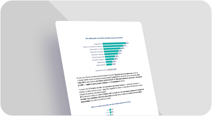 Do akej miery Slováci akceptujú jednotlivé kategórie diverzity? Najvyššia miera akceptovania sa ukazuje v prípade kolektívu kde sa nachádzajú kolegovia starší i mladší (67 %), ale tiež tím kde sa nachádzajú muži i ženy (66 %) alebo ľudia so zdravotným postihnutím (51 %). Najmenej tolerovanou skupinou v zamestnaní je LGBT+ - negatívny postoj zaujal v priemere 1 z 10 respondentov (13 %). V priemere 3 z 10 Slovákov sa cítia v ich zamestnaní ako súčasť menšiny – najčastejšie sa jednalo o menšiny z pohľadu rodovej rovnosti - ženy 7,4 %, muži 5,6 %. Niektorí z respondentov identifikovali, že patria súčasne do viacerých minoritných kategórií. 69 % zástupcov menšín sa v práci cíti dobre a 66 % si myslí, že v ich zamestnaní príslušnosť k akejkoľvek menšine nie je prekážkou. Otvorenú komunikáciu ohľadne témy rozmanitosti nevníma viac ako pätina respondentov, ktorí patria do niektorej z menšín. Informácie o Ipsose Ipsos poskytuje komplexné služby v oblasti prieskumu trhu a verejnej mienky vrátane konzultačnej činnosti. Spolupracuje s pobočkami siete Ipsos v 90 krajinách sveta. Ipsos disponuje moderným technickým zázemím pre zber a spracovanie dát a využíva tiež know-how divízií špecializovaných na výskum značky a komunikácie, mapovanie trhu a segmentáciu, zákaznícku skúsenosť a manažment, kvalitatívny výskum a výskum verejnej mienky. Je členom organizácií ESOMAR, MSPA, SIMAR a SAVA, riadi sa ich etickými princípmi a metodickými pravidlami. Viac na www.ipsos.sk a https://www.linkedin.com/company/ipsos-slovakia/ Kontakt: Barbora Ostrožovičová, PR Manager, Mobile: +421 948 379 367, [email protected] IPSOS s. r. o., Heydukova 12, 811 08 Bratislava, Slovensko, [email protected], www.ipsos.sk