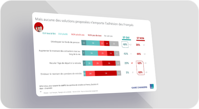 Mais aucune des solutions proposées n’emporte l’adhésion des Français OUI tout à fait OUI plutôt NON plutôt pas NON pas du tout Ne sait pas ST OUI ST NON Développer les fonds de pension 12 36 12 14 26 48% + 2 26% -4 Augmenter le montant des cotisations tout au 7 34 25 19 15 41% = 44% +2 long de la vie Reculer l’âge de départ à la retraite 7 18 26 36 13 25% -4 62% +3 Diminuer le montant des pensions de retraite 14 24 59 12 5% -1 83% +3 Selon vous, pour assurer la viabilité du système de retraite en France, faudrait-il : Base : Ensemble 30 ©Ipsos –Les Français, l’épargne et la retraite – Février 2018 - Pour Le Cercle des Epargnants