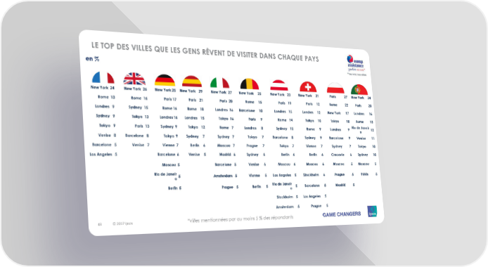 LE TOP DES VILLES QUE LES GENS RÊVENT DE VISITER DANS CHAQUE PAYS en % NewYork 24 NewYork 26 NewYork25 NewYork 29 NewYork 27 NewYork 25 NewYork 23 NewYork 21 Paris 27 NewYork 24 Rome 13 Rome 16 Paris17 Paris 21 Paris 20 Rome 15 Paris 19 Paris 12 Rome 22 Paris 20 Londres 9 Sydney 15 Rome16 Rome 18 Londres 16 Barcelone 10 Londres 15 Londres 12 NewYork 17 Londres 16 Sydney 9 Tokyo 13 Londres16 Londres 15 Tokyo 16 Paris 9 Rome 14 Tokyo 10 Tokyo 10 Rome 13 Tokyo 9 Paris 13 Sydney 9 Tokyo 12 Rome 7 Londres 8 Sydney 10 Rome 9 Londres 9 RiodeJaneir 12 o Venise 8 Barcelone 8 Tokyo 9 Sydney 7 Sydney 7 Tokyo 7 Barcelone 8 Sydney 9 Barcelone 9 Venise 11 Barcelone 5 Venise 7 Vienne 7 Berlin 6 Moscou 7 Prague 7 Tokyo 7 Vienne 7 Sydney 7 Tokyo 10 Los Angeles 5 Barcelone 6 Venise 5 Madrid 6 Sydney 6 Berlin 6 Berlin 6 Cracovie 6 Sydney 10 Moscou 5 Barcelone 5 Venise 6 Moscou 6 Moscou 6 Moscou 5 Moscou 5 Rio de Janeir 5 Amsterdam 5 Vienne 5 Los Angeles 5 Stockholm 6 Prague 5 Pékin 5 o Berlin 5 Prague 5 Berlin 5 Rio de Janeir 5 Barcelone 5 Madrid 5 o Stockholm 5 Los Angeles 5 Amsterdam 5 Prague 5 43 © 2017 Ipsos *Villes mentionnées par au moins 5 % des répondants