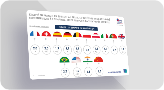 EXCEPTÉ EN FRANCE, EN SUISSE ET AU BRÉSIL, LA DURÉE DES VACANCES D’ÉTÉ RESTE INFÉRIEURE À 2 SEMAINES, APRÈS UNE FORTE BAISSE L’ANNÉE DERNIÈRE Semaines en moyenne EUROPE: 1,8 SEMAINE EN MOYENNE(=) 2,0 2,0 1,9 1,9 1,9 1,9 1,8 1,7 1,7 1,6 = -0,1 +0,1 = +0,1 +0,1 = -0,2 2,2 1,5 1,3 1,3 12 © 2017 Ipsos = +0,1