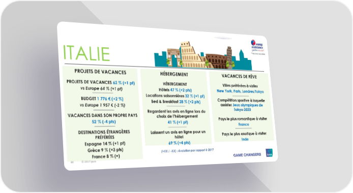ITALIE PROJETS DE VACANCES HÉBERGEMENT VACANCES DE RÊVE PROJETS DE VACANCES 62 % (+1 pt) HÉBERGEMENT Villes préférées à visiter vs Europe 64 % (+1 pt) Hôtels 47 % (+2 pts) New York, Paris, Londres/Tokyo BUDGET 1776€ (+2%) Locations saisonnières 32 % (+1 pt) Compétition sportive à laquelle vs Europe 1 957 € (-2 %) Bed & Breakfast 28 % (+2 pts) assister Jeux olympiques de Regardent les avis en ligne lors du Tokyo2020 VACANCES DANS SON PROPRE PAYS choix de l’hébergement Pays le plus romantique à visiter 52 % (-4 pts) 41 % (+1 pt) France DESTINATIONS ÉTRANGÈRES Laissent un avis en ligne pour un Pays le plus exotique à visiter PRÉFÉRÉES hôtel Espagne 14 % (+1 pt) 69 % (+4 pts) Inde Grèce 9 % (+3 pts) (+XX / -XX) : évolution par rapport à 2017 France 8 % (=) 60 60 © 2017 Ipsos