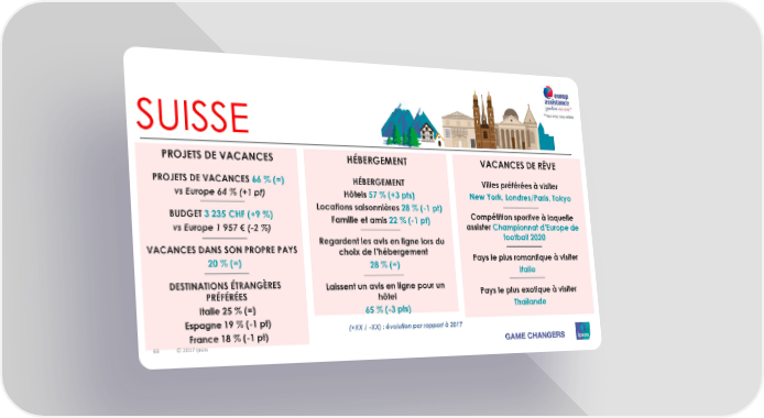 SUISSE PROJETS DE VACANCES HÉBERGEMENT VACANCES DE RÊVE PROJETS DE VACANCES 66 % (=) HÉBERGEMENT Villes préférées à visiter vs Europe 64 % (+1 pt) Hôtels 57 % (+3 pts) New York, Londres/Paris, Tokyo BUDGET 3235CHF (+9%) Locations saisonnières 28 % (-1 pt) Compétition sportive à laquelle vs Europe 1 957 € (-2 %) Famille et amis 22 % (-1 pt) assister Championnat d’Europe de Regardent les avis en ligne lors du football 2020 VACANCES DANS SON PROPRE PAYS choix de l’hébergement Pays le plus romantique à visiter 20 % (=) 28 % (=) Italie DESTINATIONS ÉTRANGÈRES Laissent un avis en ligne pour un Pays le plus exotique à visiter PRÉFÉRÉES hôtel Italie 25 % (=) 65 % (-3 pts) Thaïlande Espagne 19 % (-1 pt) (+XX / -XX) : évolution par rapport à 2017 France 18 % (-1 pt) 63 63 © 2017 Ipsos