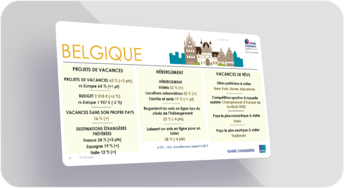 BELGIQUE PROJETS DE VACANCES HÉBERGEMENT VACANCES DE RÊVE PROJETS DE VACANCES 63 % (+3 pts) HÉBERGEMENT Villes préférées à visiter vs Europe 64 % (+1 pt) Hôtels 53 % (=) New York, Rome, Barcelone BUDGET 2318€ (+6%) Locations saisonnières 32 % (=) Compétition sportive à laquelle vs Europe 1 957 € (-2 %) Famille et amis 19 % (+1 pt) assister Championnat d’Europe de Regardent les avis en ligne lors du football 2020 VACANCES DANS SON PROPRE PAYS choix de l’hébergement Pays le plus romantique à visiter 16 % (=) 23 % (-4 pts) Italie DESTINATIONS ÉTRANGÈRES Laissent un avis en ligne pour un Pays le plus exotique à visiter PRÉFÉRÉES hôtel France 34 % (+2 pts) 58 % (-4 pts) Thaïlande Espagne 19 % (=) (+XX / -XX) : évolution par rapport à 2017 Italie 12 % (=) 61 61 © 2017 Ipsos