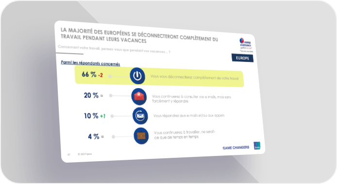 LA MAJORITÉ DES EUROPÉENS SE DÉCONNECTERONT COMPLÈTEMENT DU TRAVAIL PENDANT LEURS VACANCES Concernant votre travail, pensez-vous que pendant vos vacances…? EUROPE Parmi les répondants concernés 66% -2 Vous vous déconnecterez complètement de votre travail 20% = Vous continuerez à consulter vos e-mails, mais sans forcément y répondre 10% +1 Vous répondrez aux e-mails et/ou aux appels 4 % = Vous continuerez à travailler, ne serait- ce que de temps en temps 27 © 2017 Ipsos