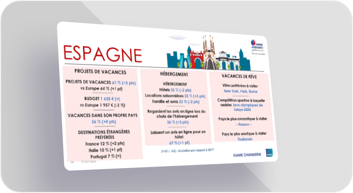 ESPAGNE PROJETS DE VACANCES HÉBERGEMENT VACANCES DE RÊVE PROJETS DE VACANCES 61 % (+3 pts) HÉBERGEMENT Villes préférées à visiter vs Europe 64 % (+1 pt) Hôtels 55 % (-2 pts) New York, Paris, Rome BUDGET 1658€ (=) Locations saisonnières 35 % (+3 pts) Compétition sportive à laquelle vs Europe 1 957 € (-2 %) Famille et amis 25 % (-2 pts) assister Jeux olympiques de Regardent les avis en ligne lors du Tokyo2020 VACANCES DANS SON PROPRE PAYS choix de l’hébergement Pays le plus romantique à visiter 56 % (+4 pts) 36 % (+3 pts) France DESTINATIONS ÉTRANGÈRES Laissent un avis en ligne pour un Pays le plus exotique à visiter PRÉFÉRÉES hôtel France 12 % (+2 pts) 67 % (+1 pt) Thaïlande Italie 10 % (+1 pt) (+XX / -XX) : évolution par rapport à 2017 Portugal 7 % (=) 59 59 © 2017 Ipsos