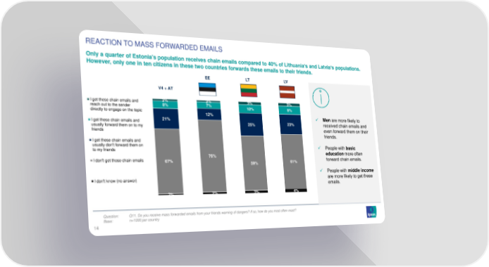 REACTION TO MASS FORWARDED EMAILS Only a quarter of Estonia's population receives chain emails compared to 40% of Lithuania‘s and Latvia‘s populations. However, only one in ten citizens in these two countries forwards these emails to their friends. EE LT LV V4 + AT I get these chain emails and 2% 2% 3% 3% reach out to the sender 8% 7% 10% 9% directly to engage on the topic 12% 21% ✓ Menare more likely to I get these chain emails and 25% 23% received chain emails and usually forward them on to my even forward them on their friends friends. I get these chain emails and usually don't forward them on ✓ People with basic to my friends education more often 76% forward chain emails. I don't get those chain emails 67% 59% 61% ✓ People with middle income I don't know (no answer) are more likely to get these emails. 2% 2% 3% 4% Question: Q11.Doyoureceivemassforwardedemails from your friends warning of dangers? If so, how do you most often react? Base: n=1000 per country 14